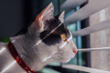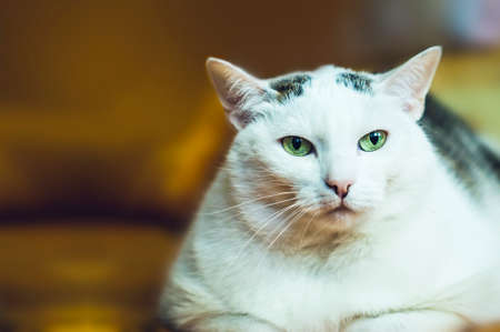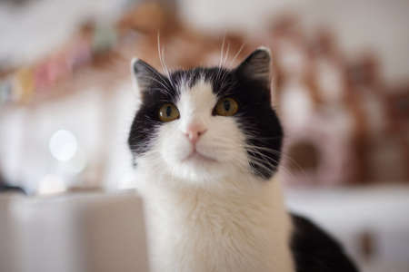 Photo of domestic cat (pet) in closed plan, with a fixed and cute look. Real animal in a real situation.