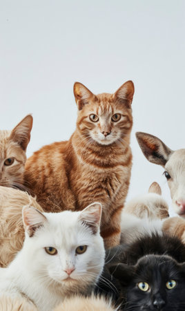 Assorted cats and dogs in studio setting with white background for versatile design