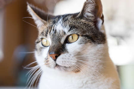 Curious cat looks away frightened. Pet in bright daylight. Kitten with colored fur and a cute muzzle. Domestic animals theme. Close up and copy space.