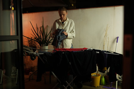Woman standing on a balcony at night sorting clothes on a drying rack under warm lighting