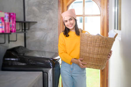 Beautiful young Caucasian women In casual wear, wearing yellow rubber gloves Prepare for laundry, clothes, and house cleaning. Attractive clean modern housekeeper, smiling and happy for the chore.