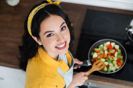 high angle view of cheerful brunette woman mixing sliced vegetables on frying pan with spatula