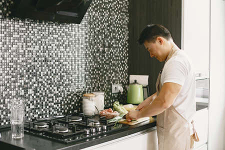 Asian man prepare dinner in a kitchen
