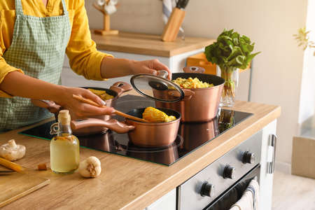 Woman cooking risotto in kitchen