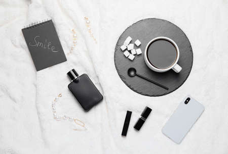 Composition with cup of coffee, mobile phone, perfume, notebook and cosmetics on white plaid