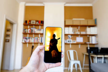 Watching online concert at home. Singer with a guitar on the screen of the smartphone.