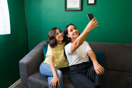 Posting a picture on social media. Beautiful woman taking a selfie with her best friend while hanging out in the living room