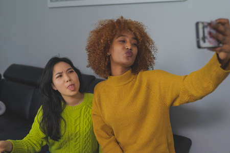 Multiracial friendship. Asian and african american black woman taking selfie using smartphone. High quality photo