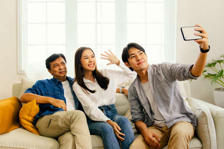 Perfect happy family : Vacation amazing homely happiness asian family lounging on the sofa in the living room taking selfie together between the smiling father son and daughter.
