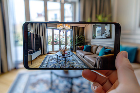 Person is holding a cell phone up to a living room. The room is filled with furniture, including a couch, a coffee table, and a potted plant. The atmosphere of the room is cozy and inviting