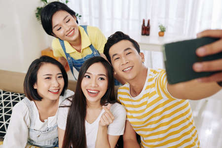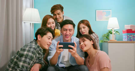 front view of happy asian friends smile watch man using phone playing game - horizontal landscape mobile