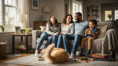 A diverse family is captured enjoying quality time together in a well-lit living room. They are seated on a comfortable sofa, interacting with each other, while a dog rests nearby. The scene features natural light, soft textures, and a cozy atmosphere. Suitable for illustrating domestic life and family-related content.