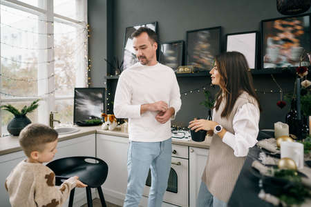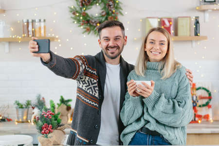 Couple in love husband and wife talk together on video call with friends and family, young family happily celebrates Christmas and New Year breath at home