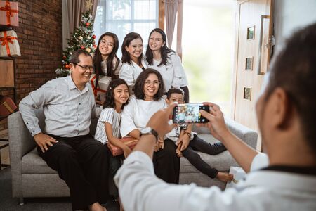 Happy family : Brother takes pictures of father and sister enjoying the relationship of Asian families in the living room together for a fun photoshoot : Family day concept