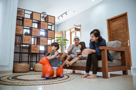 son and daughter cheering for their parents who are playing exciting racing game with joysticks in the living room at home during chinese lunar new year holiday