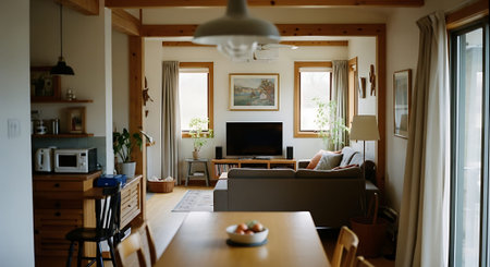 A warm, inviting living room with a coffee table featuring a mug, glasses, books, and a plant. A comfortable sofa with pillows and a cozy blanket is visible.