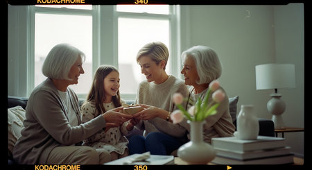 Multigenerational family sharing a joyful baking moment in a warm, sunlit living room with festive accents and a relaxed atmosphere. Suitable for lifestyle, family and holiday marketing.