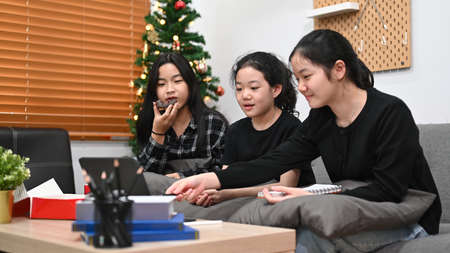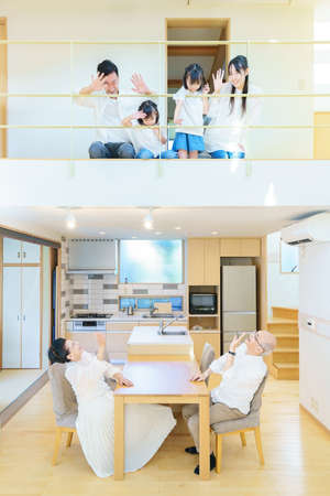 asian family ignoring each other while spending time on mobile phones. vr games and video games at home. emotional son shouting while playing. translation: spring and congratulations
