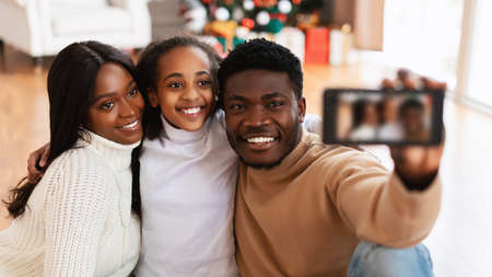 Portrait of African american family having lunch together and taking a selfie with phone at home. Family and lifestyle concept.