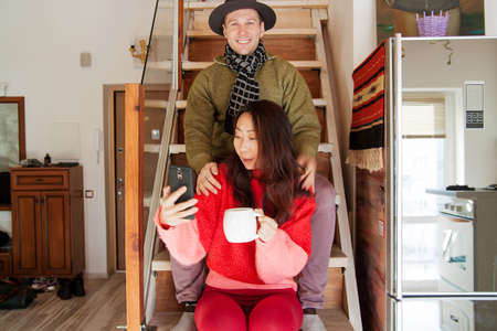 Portrait of young cheerful couple guy and girl standing at home in the kitchen in the apartment and hugging something discussing.