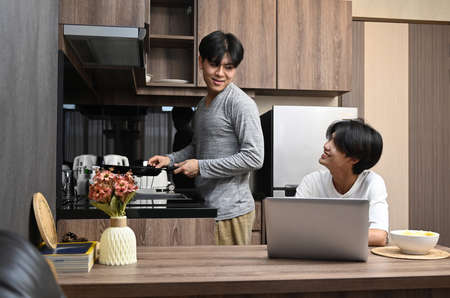 Young gay couple cooking in the kitchen together. Homosexual relationships and alternative love lifestyle concept.