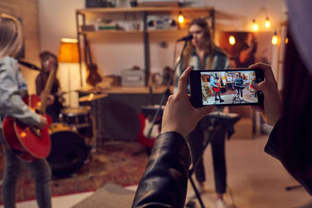 Girls with smartphone taking video of her band playing musical instruments in studio