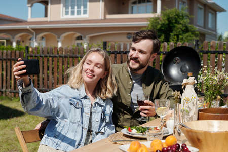 Young cheerful couple or friends making selfie on smartphone during outdoor dinner or party while sitting by served table