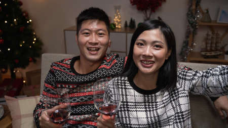 joyful Taiwanese young couple holding wineglasses and talking happily to mobile camera while having a video call with friends in the living room on Christmas eve