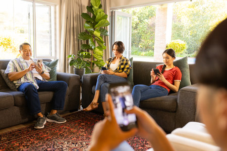Using smartphones, family sitting on couches in living room, relaxing together. relaxation, technology, bonding, leisure, home, indoors