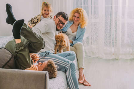 a happy, friendly family sits on the couch at home: dad tickles his teenage son, little daughter laughs, mom is touched, looks at her children with love, a red poodle dog sits on the owners lap. high quality photo