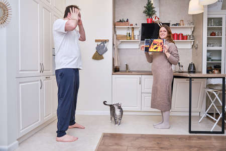 A pregnant wife shows her funny husband an ultrasound with an unborn child, humor. Adult woman and man in home kitchen with ultrasound, surprise about pregnancy