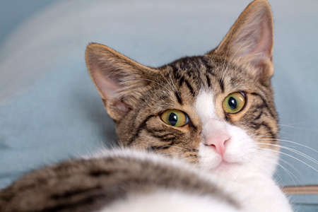 Closeup portrait of a beautiful tabby cat with striking blue eyes