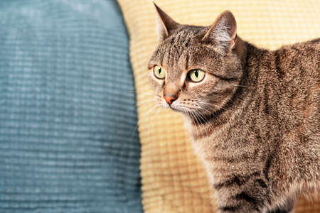 Striped tabby beige cat with green eyes against blue yellow pillows cute pets animals copy space selective focus