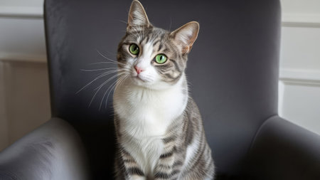 A domestic cat is the subject, shown seated on a chair. The cat's fur displays a combination of gray and white. The composition features soft lighting with focus on the feline. Suitable for various projects, including advertising or educational content.
