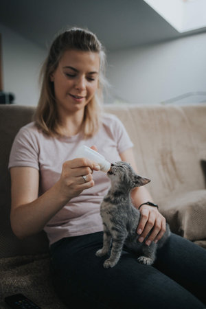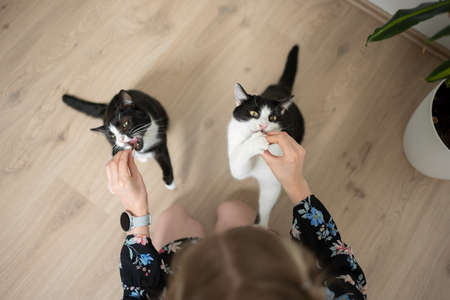 high angle view of a female pet owner feeding two cats simultaneously side by side