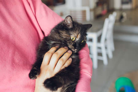 A gray striped cat with green eyes is sitting in the girls arms. Womens hands are stroking a pet. They are sitting on the bed in the bedroom. International Cat Day