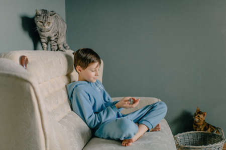 child boy in blue suit at home and his pets