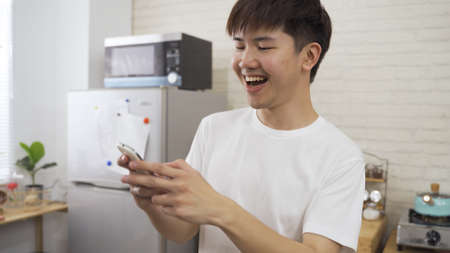 close up carefree asian boy tapping on the phone screen is drinking tea while enjoying himself playing mobile games at home.