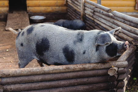 gray with a black pig, a mixture of wild boar, in a pen in the village