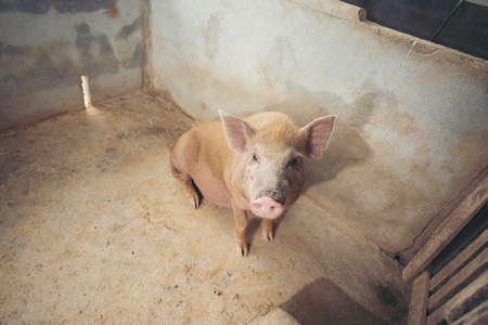 Portrait of a cute little pig in a pigsty. Farm animals.