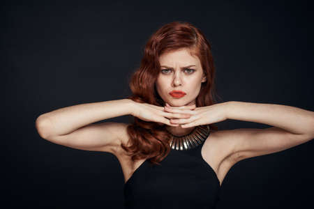 Stylish redhead woman in black leather jacket and silver chain necklaces posing for a fashion photoshoot
