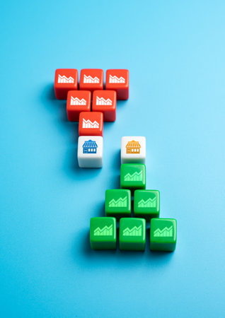 Stack of wooden cubes with red arrows going up. The process of successful business development, economy, increasing productivity, performance and profit concept