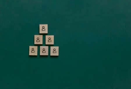 Leadership and team management concept with a series of wooden blocks with people silhouettes structured into a pyramid.