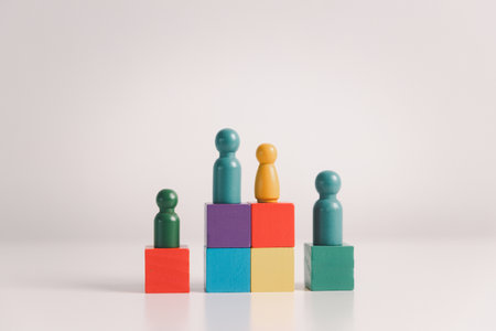 Concept of diversity, inclusion, equality is highlighted in team setup, wooden elements, symbolizing leadership, authority, influence, strong communication skills, inclusive organizational structure.