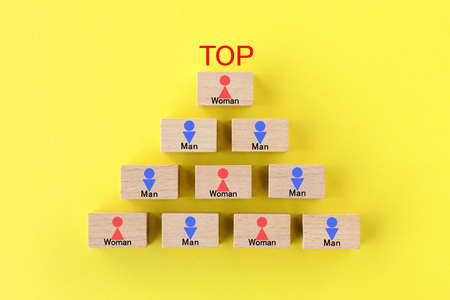 wooden blocks with figures on a gray yellow background, hierarchical organizational structure of management, effective management model in the organization, top view