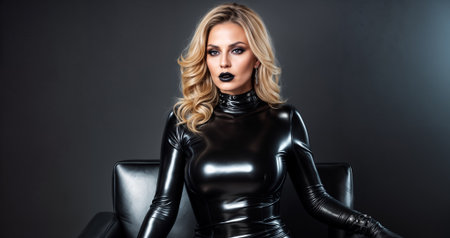 woman with blonde hair and black lipstick sits on a chair wearing a black latex bodysuit.