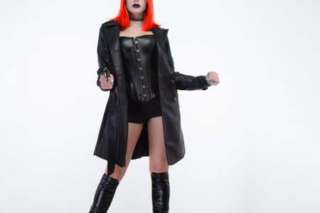 Young beautiful woman in a black leather corset and cloak with a gun in her hand on a white background