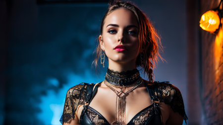 Beautiful woman in black lingerie and leather belt dominates the background of lamps and smoke