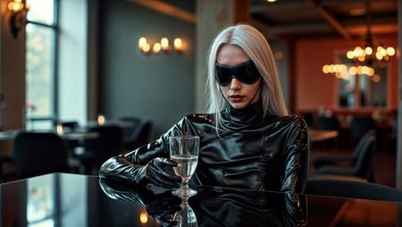Mysterious Woman in Black Vinyl Outfit and Blindfold Enjoying a Drink in Stylish Restaurant..