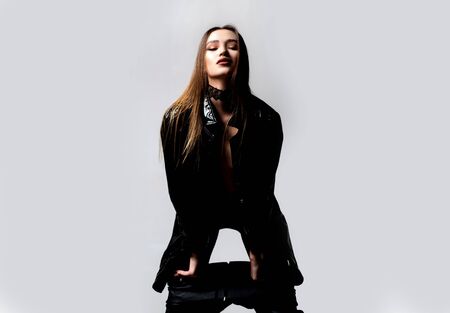 sexy Beautiful young woman with wet hair, wear leather. beauty girl over black background, make-up